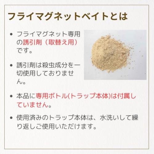 ハエを臭いで捕獲するフライマグネットの専用誘引剤です。フライマグネット容器を繰り返し使われる場合は、この誘引剤をご利用ください。
