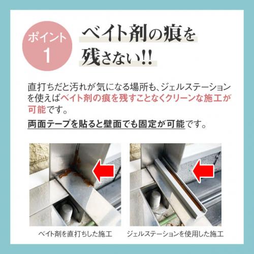 直打ちだと気になる場所も、ジェルステーションを使えばベイト剤の痕を残すことなくクリーンな施工が可能です。 両面テープを貼ると壁面でも固定ができるため、ベイト剤を垂らすことなく施工できます。