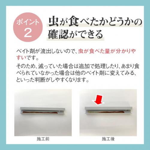 ベイト剤が流出しないので食べられた量が分かりやすいです。 そのため、減っていた場合は追加で処理したり、あまり食べられていなかった場合は他のベイト剤に変えてみる、といった判断がしやすくなります。