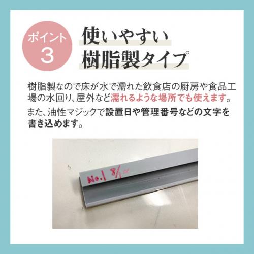 樹脂製なので床が水で濡れた飲食店の厨房や食品工場の水回り、屋外など濡れるようなところでも使えます。 また、油性マジックで設置日や管理番号などの文字を書き込めます。