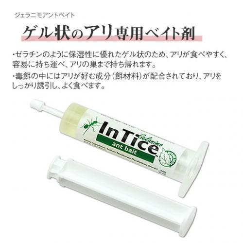 ジェラニモアントベイトはジェルタイプのアリ用毒餌剤です。アリを誘引、喫食させます。シリンジによる処理なので使いやすく、匂わないので、屋内のアリ対策にもおすすめ。さまざまな種類のアリに有効です。