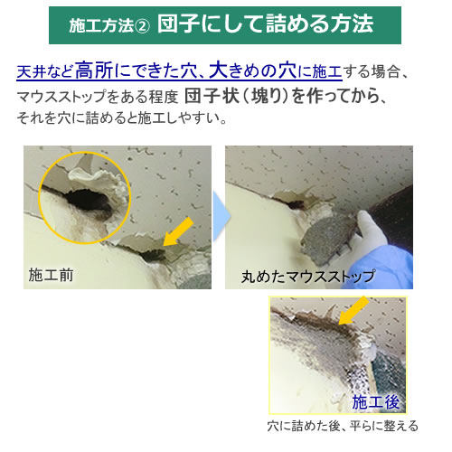 天井など高所にできた穴、大きめの穴に施工する場合、マウスストップをある程度 団子状(塊り)を作ってから、それを穴に詰めると施工しやすい場合があります。