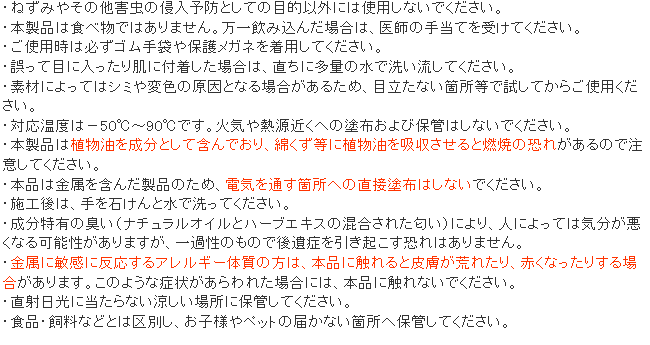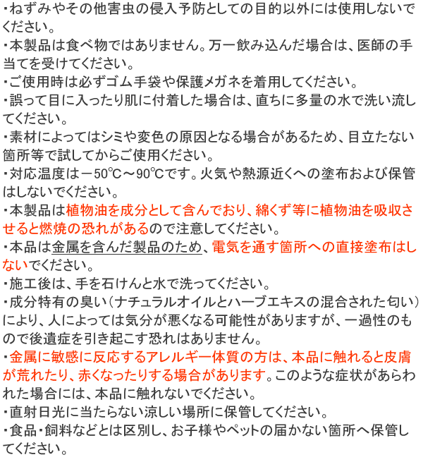 表面だけが固まり、中は柔らかいままのネズミ用の防鼠コーキング剤です。もしネズミが本剤を齧ろうとしても、中がべた付くので、その感触をネズミは嫌がり、齧ることやめ、突破を防ぎます。ハーブ成分入りで忌避効果もあります。