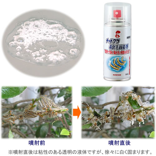 チャドクガ防除剤 固着剤が固まりますチャドクガ防除剤は、チャドクガなど毛虫駆除用の固着剤のスプレーです。