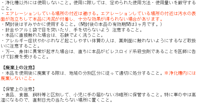この薬剤は発泡錠(錠剤)タイプの薬で、槽内に投入するだけです。また、デミリンは浄化槽ではたらく有用な微生物にも悪影響を与えません。