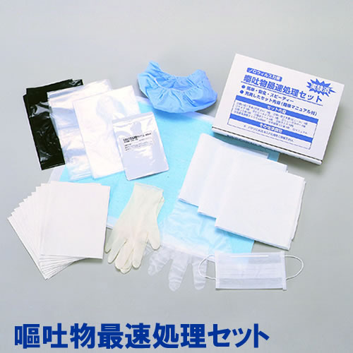 嘔吐物処理には、嘔吐物処理セットが便利。充実したセット内容で、素早く汚物・嘔吐物処理が可能。セットには塩素系の除菌タブレットも付属。