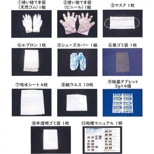 使い捨て手袋(天然ゴム)1組、使い捨て手袋(ビニール)1組、マスク 1枚、ビニールエプロン1枚、シューズカバー1組、黒ゴミ袋1枚、吸水シート4枚、紙ウエス 10枚、除菌タブレット(塩素系) 3g×4錠、半透明ゴミ袋1枚、簡単マニュアル 1部 - ・除菌タブレットの成分:ジクロロイソシアヌル酸ナトリウム