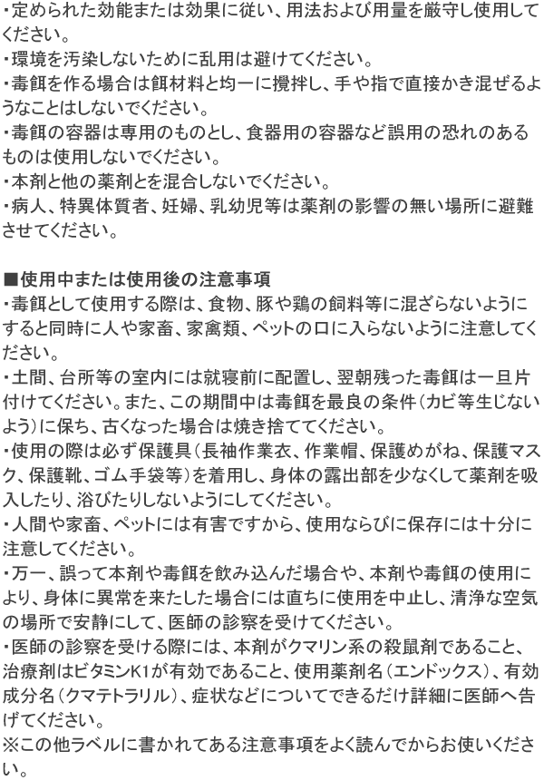 - ・効能・効果:クマネズミ・ドブネズミ・ハツカネズミなどのネズミ駆除