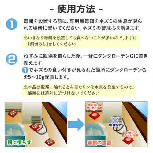 ※ダンクローデンGを施工後、生き残ったネズミを駆除するには、別の殺鼠剤(慢性毒タイプ(例:エンドックス)や形状の異なるもの)を用いてください。