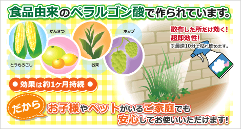 成分は食品由来の「ペラルゴン酸」です。トウモロコシや柑橘、茶やホップなどの身近な食品に含まれている成分です。
