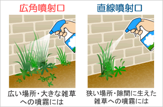 使う場所に合わせた2WAYスプレーです。 広い場所や大きな雑草をまんべんなく処理したいときは「広角噴射口」を、狭い場所や狙った場所に処理したいときは「直接噴射口」をお使いください。