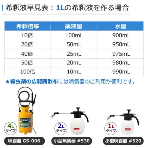 ●直接噴霧:40~50倍液を50ml/㎡ ●残留噴霧:10~20倍液を50ml/㎡ |