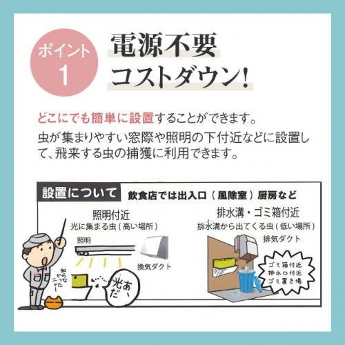 虫が集まりやすい窓際や照明の下付近などに設置して、飛来する虫の捕獲に利用できます。