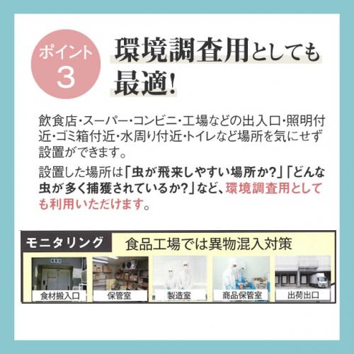 (1)捕虫器(ライトトラップ)の設置に切り替えたり、(2)侵入経路を特定して、殺虫剤を処理するなど次のステップ(防虫対策)に活用されることもおすすめします。