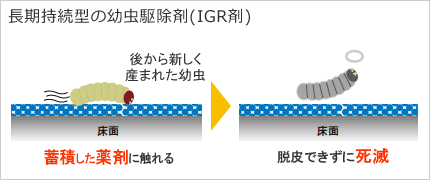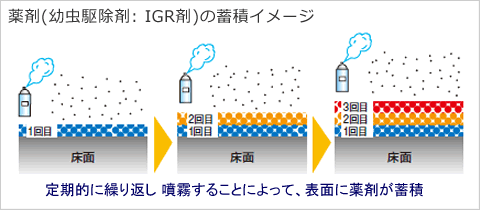 → 繰り返し使用することで、残効性のあるIGR剤(幼虫駆除成分)が床面に重なり、むらなく蓄積します。
