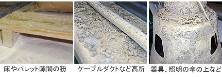 床の粉だまり、清掃しづらい高所(照明の傘、ケーブルダクトの上など)にたまった粉にも薬剤が行き渡り、粉だまりに生息する害虫(食品害虫の幼虫)に効果を発揮します。