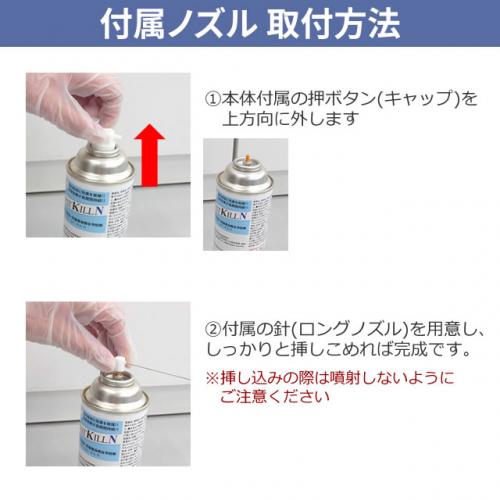 発生源と考えられる場所に向けて20〜30cm以上の距離から適宜(1箇所あたり5〜10秒目安に)噴射してください。