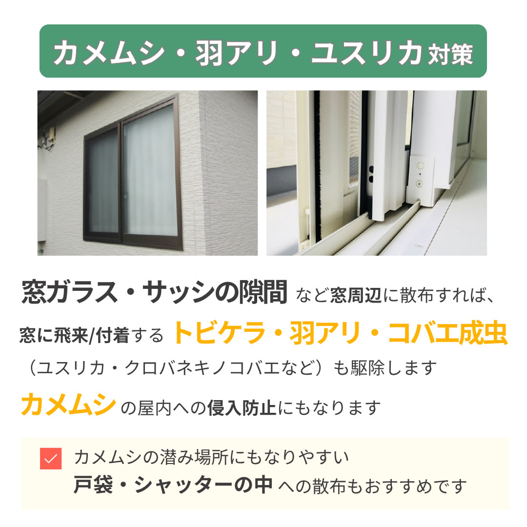 - ・適用害虫 :不快害虫(チャタテムシ・ムカデ・ヤスデ・ワラジムシ・ダンゴムシ・カマドウマ・コオロギ・ハサミムシ・カメムシ・トビムシ・クモ・アリ等の駆除、窓に止まるユスリカ・羽アリなど飛翔虫の駆除