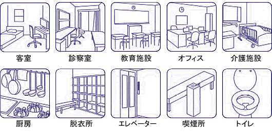 主成分の「二酸化塩素」は酸化力が強いため、悪臭の原因となる物質も酸化分解します。トイレや生ゴミ、腐敗臭、エアコンフィルター、タバコ臭、排泄臭など室内空間の不快な臭いを消臭します。