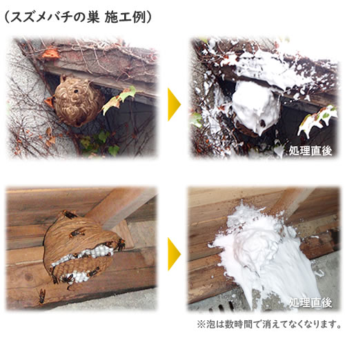 泡がスズメバチ・アシナガバチの巣を包み込み、効果的に駆除します。