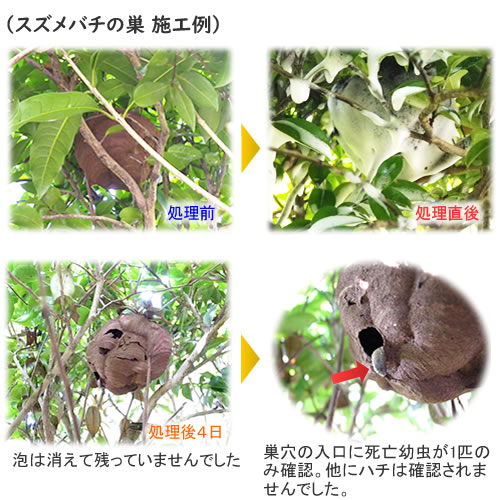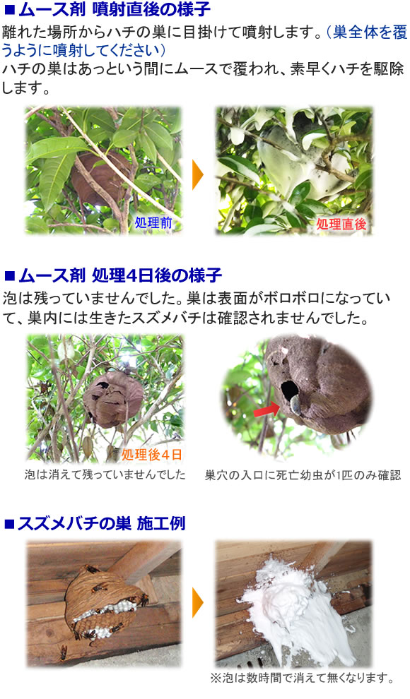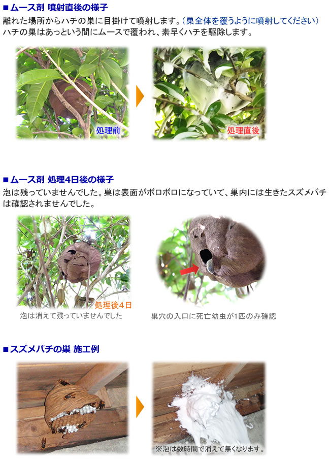 ムースの泡が丸ごと包んで スズメバチの巣を撃退!!