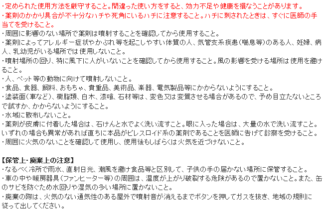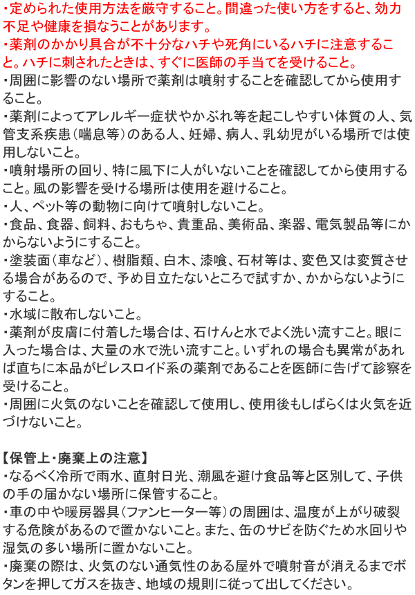 ハチが見当たらなくても、むやみに巣に近づかないでください。巣の外で働いてた働きバチが戻ってくるため非常に危険です。飛んでいるハチや戻りバチには使用しないでください。