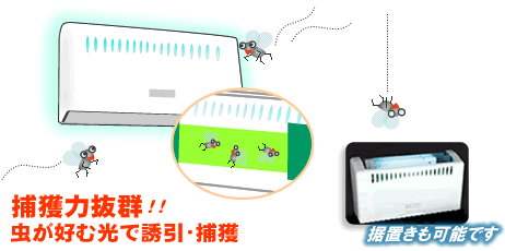 虫の好む光で、室内のハエ・コバエ・その他の虫を誘引し、捕獲する捕虫器(ライトトラップ)です。 誘引された虫は、器械の中にセットされた捕虫紙(ハエ捕り紙)で捕獲します。