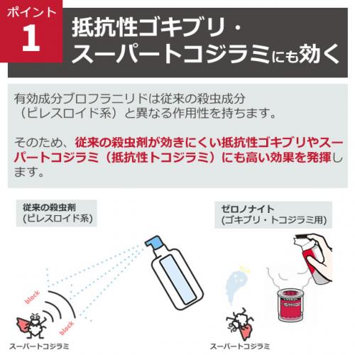 新有効成分テネベナール配合のため、従来の薬剤に強くなったトコジラミ(スーパーナンキンムシ)、抵抗性ゴキブリ対策にもおすすめです。