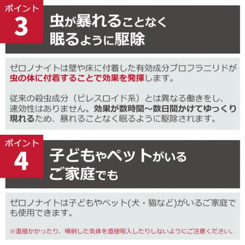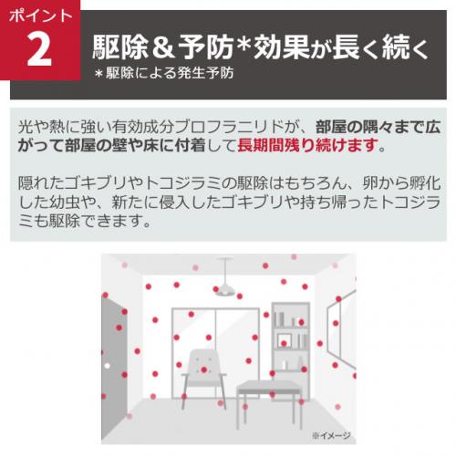 遅効性の成分のため、薬剤に触れたり付着した場所を歩いたトコジラミやゴキブリに対し、数時間〜数日程度かけて効果を発揮します。