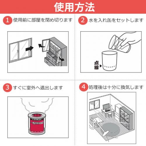 使用する前に、部屋の窓や換気口などを閉め、害虫の隠れていそうな所(戸棚・引き出し、押入れなど)はできるだけ開放します。