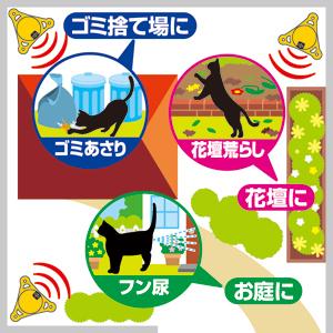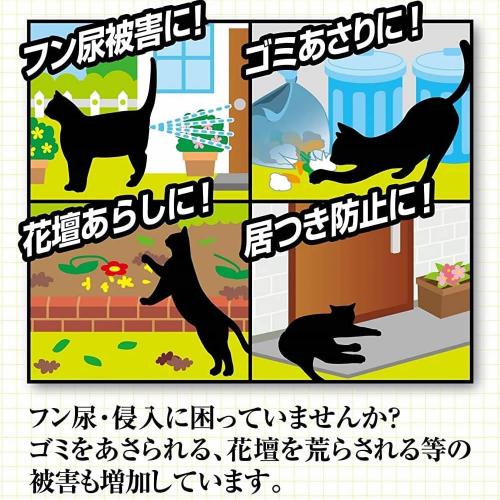 猫の聴覚、視覚、触覚を強烈に刺激し、驚かせて追い払います。イヤなニオイがないのでお庭で安心してお使いいただけます。