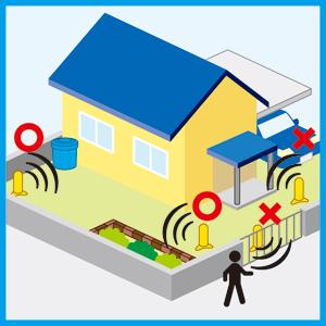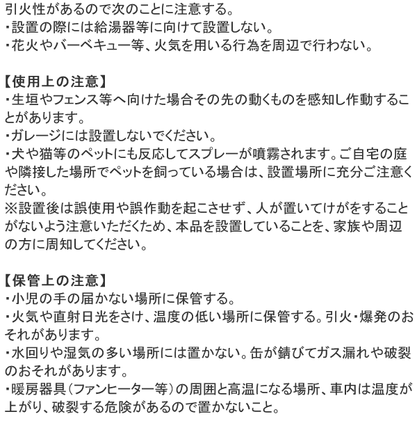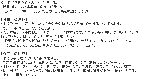 ※犬や猫等のペットにも反応してスプレーが噴射されます。ご自宅の庭や隣接した場所でペットを飼っている場合は、設置場所に充分ご注意ください。
