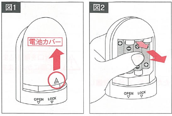 (1)器具にかかっている透明カバーを外し、▲部分を押しながら電池カバーをスライドさせて取り外します。(図1)