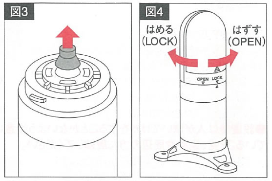 (4)本体のOPENの位置に缶の△印をあわせ差込み、LOCKの位置までねじ込んでください。(図4)