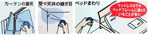 (例)ベッド周り・壁や天井のつなぎ目・カーテンの裏側など