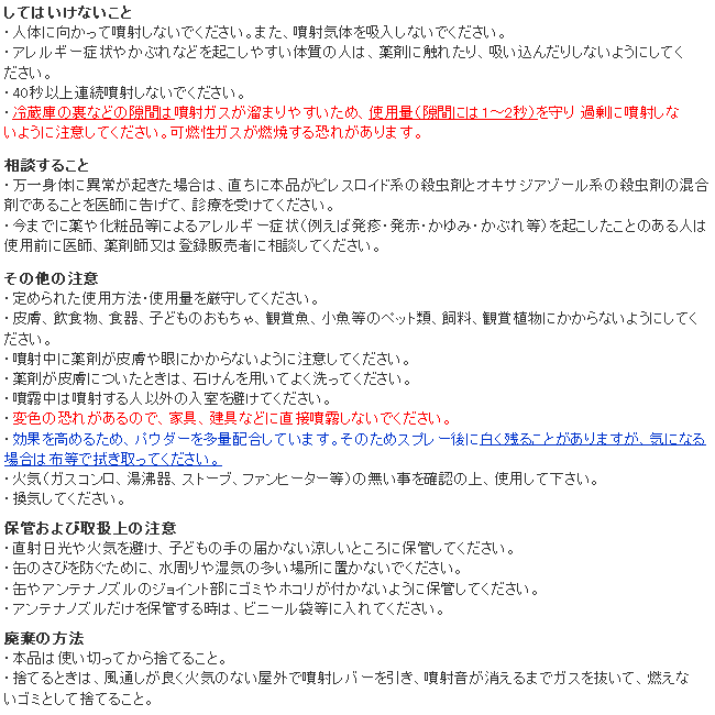 - ・効能・効果:ゴキブリ、ノミ、トコジラミ(ナンキンムシ)、イエダニの駆除
