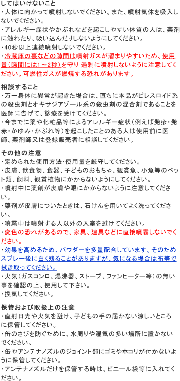 ★害虫が逃げ込んだ隙間には約1〜2秒噴射してください。隙間から出てきた害虫にはさらに上記の量を再度、直接噴射してください。