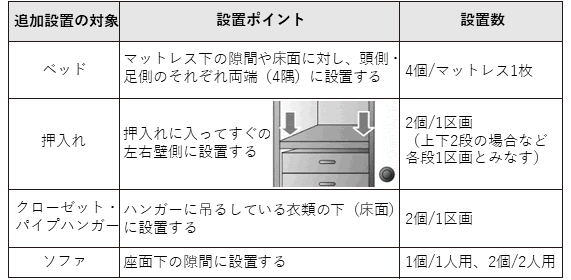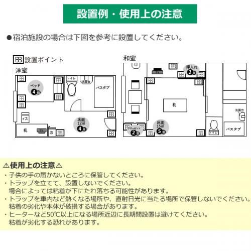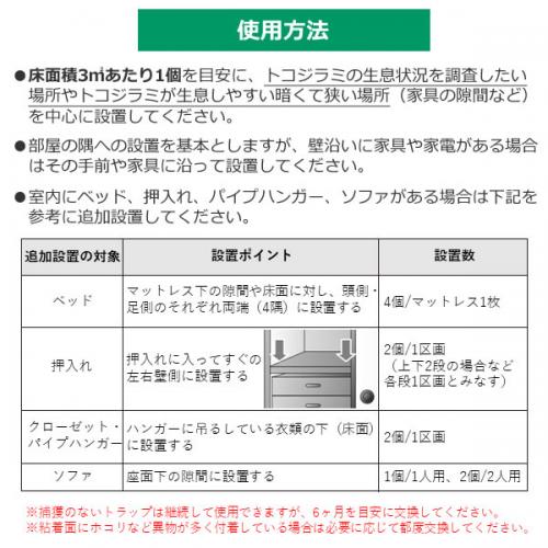 ●床面積3㎡あたり1個を目安にトコジラミの生息状況を調査したい場所や、トコジラミが生息しやすい暗くて狭い場所(家具の隙間など)を中心に設置してください。 設置の際に面ファスナーや両面テープなどで固定しても問題ございません。