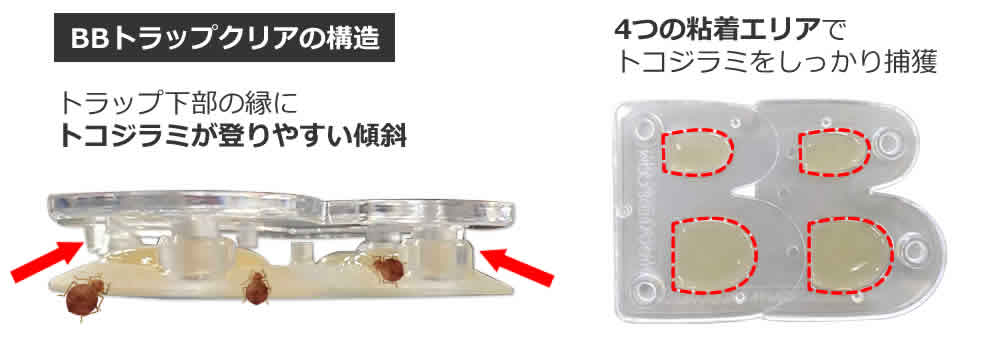 BBトラップ下部の縁には傾斜があるため、トラップに近づいたトコジラミが登って中へ入りやすく、4つの粘着エリアでしっかり捕獲します。