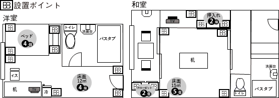 ●室内にベッド、押入れ、パイプハンガー、ソファがある場合は下記を参考に追加設置してください。