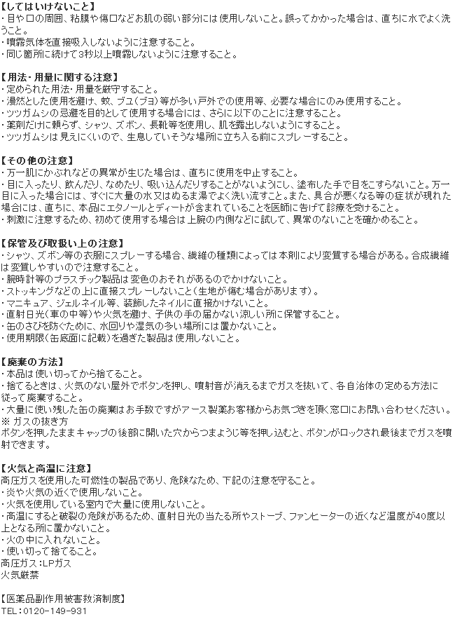 - ・適用害虫:蚊、ブユ(ブヨ)、アブ、ノミ、イエダニ、マダニ、サシバエ、トコジラミ(ナンキンムシ)、ツツガムシの忌避