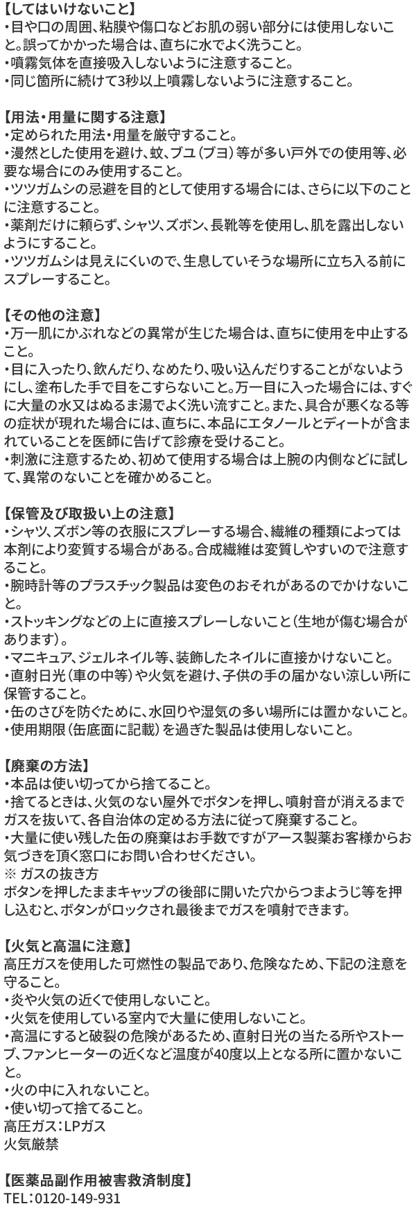 | 12才未満 | 使用しないこと(本品はディート濃度が高いため、ディート濃度12%以下の製品を使用すること) |