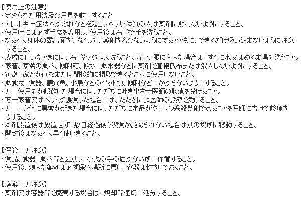 - ・使用用途:畜・鶏舎内及び周辺のネズミの駆除