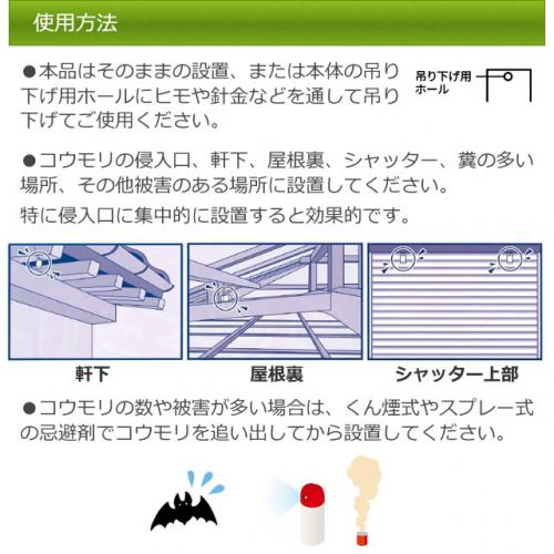 コウモリの被害がある場所にそのまま置く、または吊り下げるだけです。