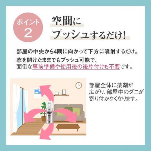 部屋の中央から4隅に向かって下方に噴射するだけ。 窓を開けたままでもプッシュ可能で、面倒な事前準備や使用後の後片付けも不要です。 部屋全体に薬剤が広がり、部屋中のダニが寄り付かなくなります。