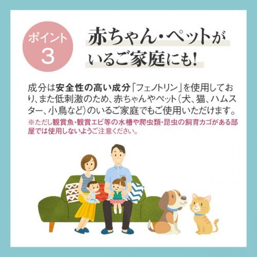 成分は安全性の高い成分「フェノトリン」かつ低刺激のため、赤ちゃんやペット(犬、猫、ハムスター、小鳥など)のいるご家庭でもご使用いただけます。 ※ただし観賞魚・観賞エビ等の水槽や爬虫類・昆虫の飼育カゴがある部屋では使用しないようご注意ください。