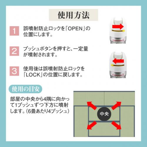 ・部屋の中央から4隅に向かって、1プッシュずつ下方に噴射します。(6畳あたり4プッシュ)