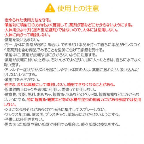 - ・有効成分:フェノトリン(ピレスロイド系)、MGK264、その他 エチルアルコールなど2成分※火気厳禁