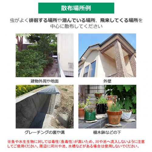 ※本剤はピレスロイド系の殺虫剤で、魚や水生生物に対しては毒性(魚毒性)が高いため、川や池へ流入しないように注意してご使用ください。