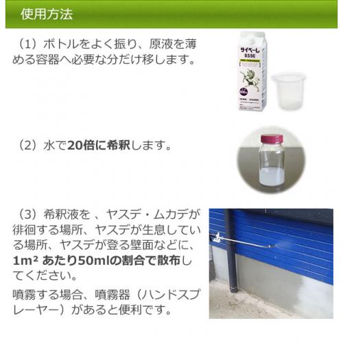 サイベーレ0.5SCは白色液体で、ピレスロイド系殺虫剤(フロアブル剤)です。屋外用の殺虫剤で、水で薄めて(20倍希釈)使用します。
